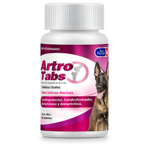 ARTRO TABS Coadyuvante en el mantenimiento de la funcionalidad de las articulaciones del perro. Esta recomendado en perros como preventivo en cachorros de razas predispuestas a enfermedad articular degenerativa. Desgaste articular físico debido a sobre peso, ejercicio elevado o edad avanzada, artrosis, artritis traumática y posoperatoria, otoplastía estética, cirugía articular o de tendones. Auxiliar en la regeneración de fracturas, displasia de cadera, espondilosis y espondiloartrosis, osteitis, ostecondritis disecante y osteocondrosis, síndrome del carpo laxo. También posee un efecto restaurador dérmico, fortalece las uñas y la estructura del pelo.