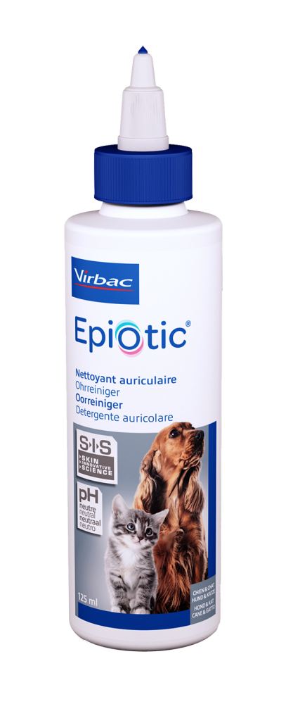 EpiOtic es el complemento perfecto para el tratamiento de las otitis: un limpiador auricular de solución micelar con pH neutro de óptima tolerancia, para la limpieza de los oídos de tu mascota.