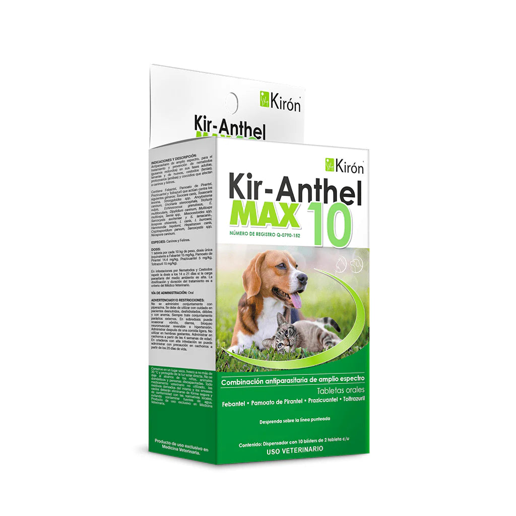 Kir-Anthel MAX: Antiparasitario de amplio espectro, para el tratamiento y prevención de nematodos (gusanos redondos) en sus fases adultas, larvarias y de huevos, cestodos (tenias), protozoarios (amibas) y coccidios que afectan a Caninos y Felinos.