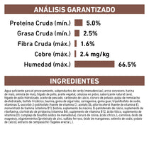 Análisis garantizado: Proteína Cruda (mín.) 5.0%, Grasa Cruda (mín.) 3.5%, Fibra Cruda (máx.) 2.0%, Humedad (máx.) 64%, Cobre (máx.) 3.0 mg/kg. Contenido calórico: 1514 kcal EM/kg; 621 kcal EM/lata (calculado).