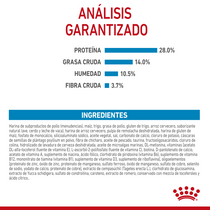 Harina de pollo, arroz cervecero, maíz, trigo, harina de gluten de maíz, gluten de trigo, grasa de pollo, saborizantes naturales (ave), pulpa de remolacha deshidratada, silicoaluminato sódico, carbonato de calcio, fosfato de potasio, aceite vegetal, sal, aceite de pescado, cáscara de plántago molida, L-lisina, fructooligosacáridos, hidrolizado de levadura de cerveza deshidratada, cloruro de colina, taurina, DL-metionina, clorhidrato de glucosamina, vitaminas [acetato de DL-alfa tocoferol (fuente de vitamina E), L-ascorbil-2polifosfato (fuente de vitamina C), biotina, D-pantotenato de calcio, acetato de vitamina A, suplemento de niacina, clorhidrato de piridoxina (vitamina B6), mononitrato de tiamina (vitamina B1), suplemento de riboflavina (vitamina B2), ácido fólico, suplemento de vitamina B12, suplemento de vitamina D3], extracto de cempasúchil (Tagetes erecta L.), oligoelementos (proteinato de zinc, óxido de zinc, sulfato ferroso, proteinato de manganeso, proteinato de cobre, sulfato de cobre, óxido manganoso, yodato de calcio, selenito de sodio), sulfato de condroitina, extracto de romero, conservado con mezcla de tocoferoles naturales y ácido cítrico.