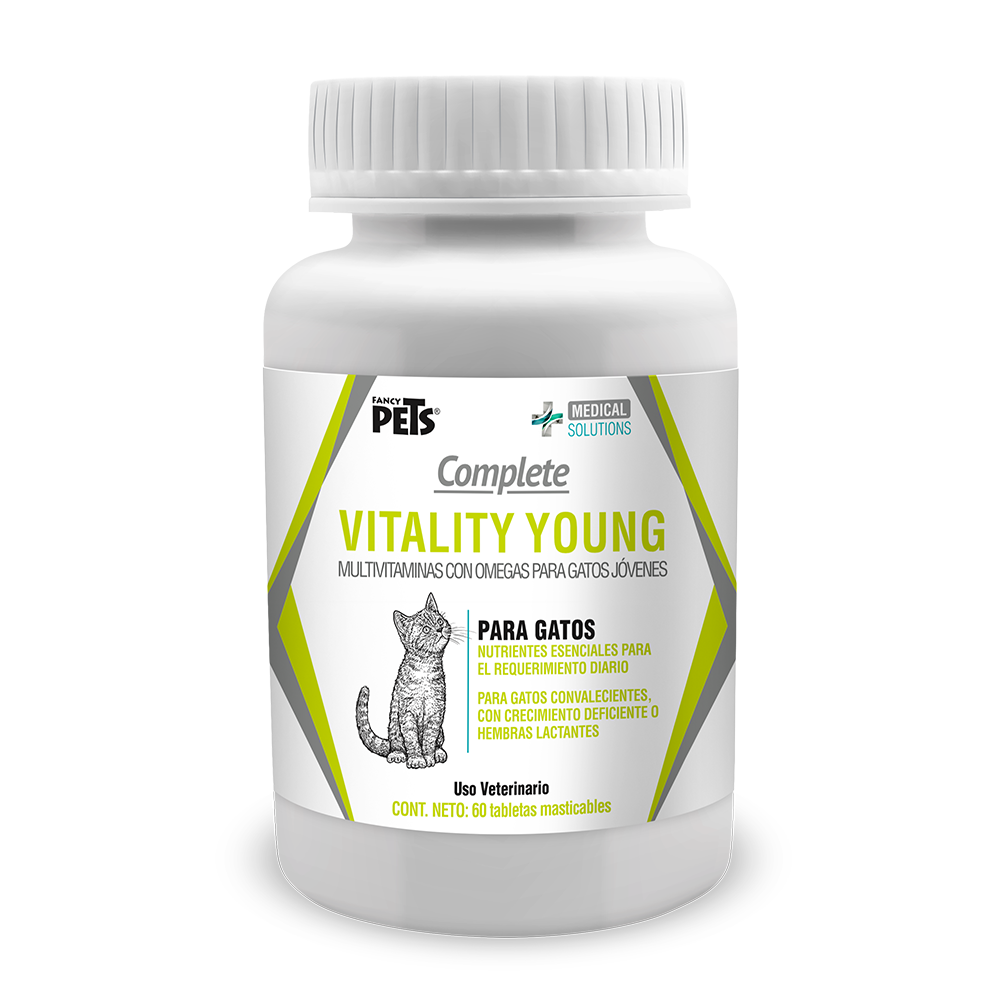 Características: Suplemento multivitamínico masticable con omegas para gatos jóvenes mayores a 12 semanas de edad (60 tabletas) Complete Vitality de Medical Solutions es un suplemento formulado para cubrir las necesidades diarias de vitaminas, minerales, aminoácidos y ácidos grasos en la dieta de gatos jóvenes mayores de 12 semanas, convalecientes, con crecimiento deficiente o hembras lactantes. La fórmula exacta para sus necesidades le ayudará a incrementar su vitalidad, recuperarse más rápido de una enfermedad o tratamiento médico, ganar peso y mejorar su calidad de vida.