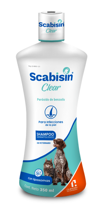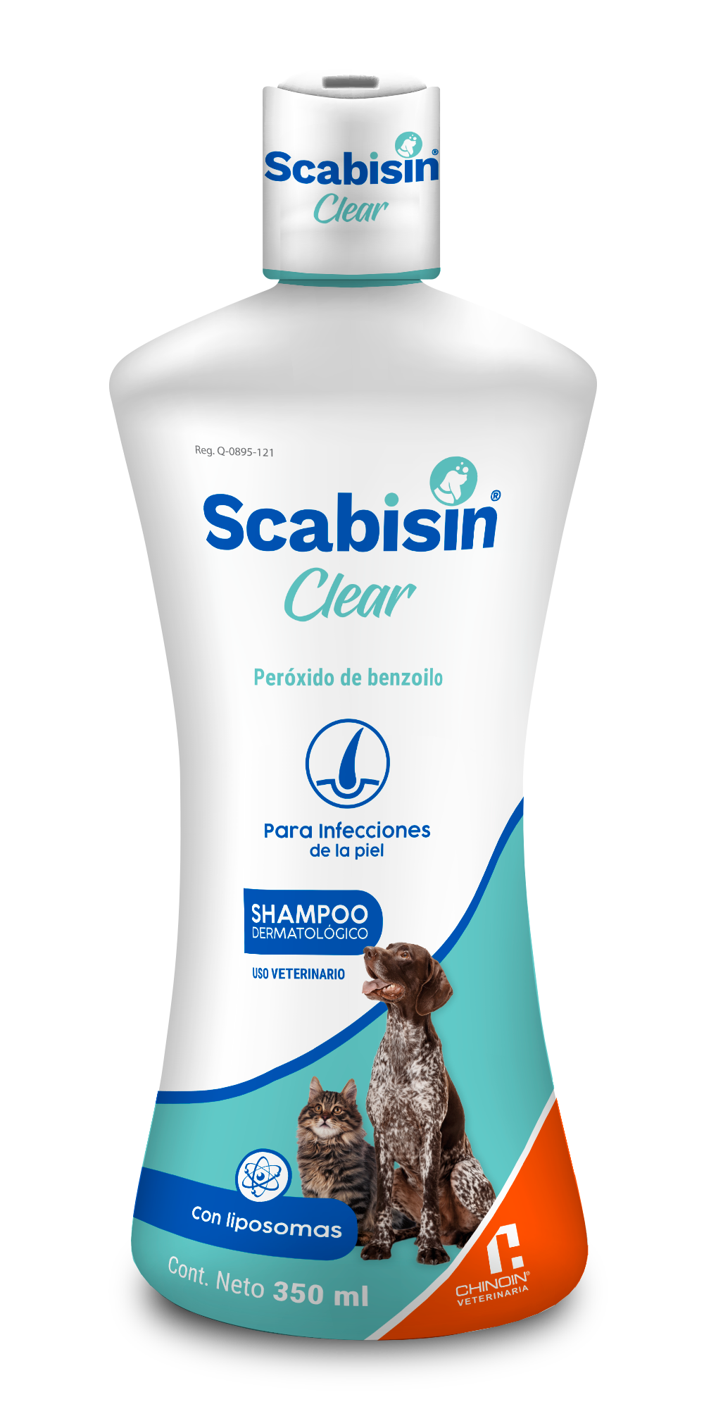 SCABISIN CLEAR® es un shampoo dermatológico que tiene acción bactericida, antiinflamatoria y comedolítica. Está indicado para el tratamiento piodermas superficiales y profundos, en foliculitis, furunculosis, demodicosis, acné, síndrome comedogénico y adenitis sebácea.