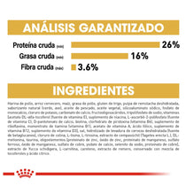 Arroz cervecero, harina de subproducto de pollo, maíz, grasa de pollo, gluten de trigo, pulpa de remolacha deshidratada, saborizante natural (ave), aceite de pescado, silicoaluminato sódico, aceite vegetal, cloruro de potasio, fructooligosacáridos, tripolifosfato de sodio, sal, taurina, hidrolizado de levadura de cerveza deshidratada, harina de huevo deshidratado, fosfato monopotásico, DL-metionina, cloruro de colina, vitaminas [DL-alfa tocoferol (fuente de vitamina E), inositol, niacina, L-ascorbil-2-polifosfato (fuente de vitamina C), D-calcio pantotenato, biotina, clorhidrato de piridoxina (vitamina B6), riboflavina (vitamina B2), mononitrato de tiamina (vitamina B1), acetato de vitamina A, ácido fólico, suplemento de vitamina B12, suplemento de vitamina D3], extracto de cempasúchil (Tagetes erecta L.), clorhidrato de glucosamina, L-tirosina, oligoelementos (óxido de zinc, sulfato ferroso, proteinato de zinc, óxido de manganeso, proteinato de manganeso, sulfato de cobre, yodato de calcio, selenito de sodio, proteinato de cobre), sulfato de condroitina, extracto de romero, conservado naturalmente con una mezcla de tocoferoles y ácido cítrico.